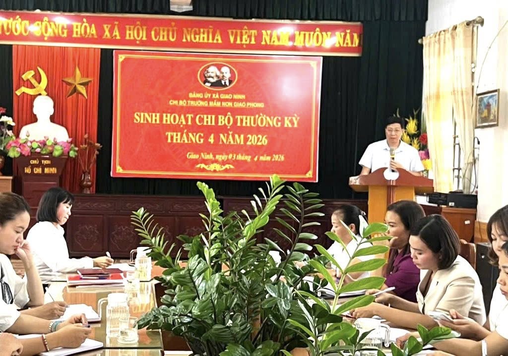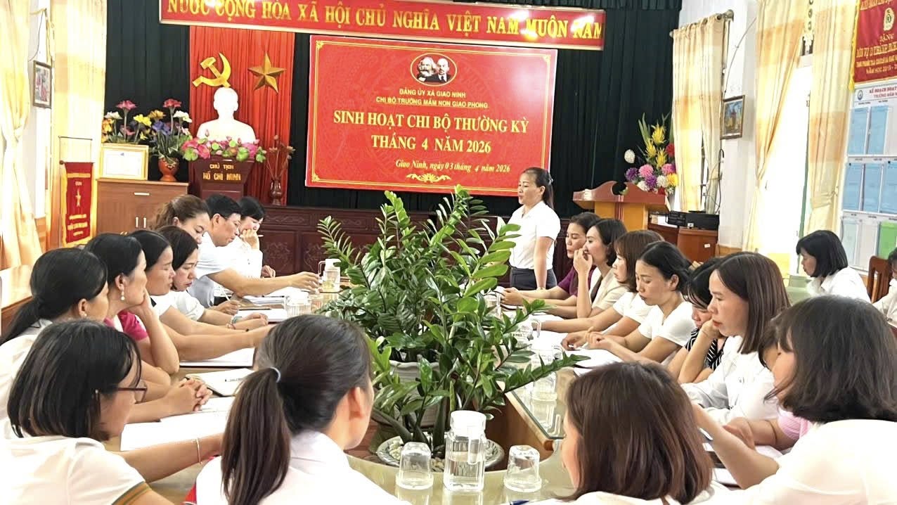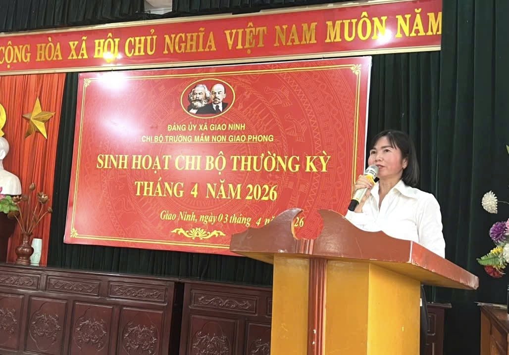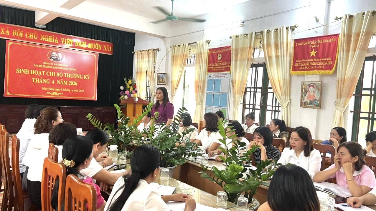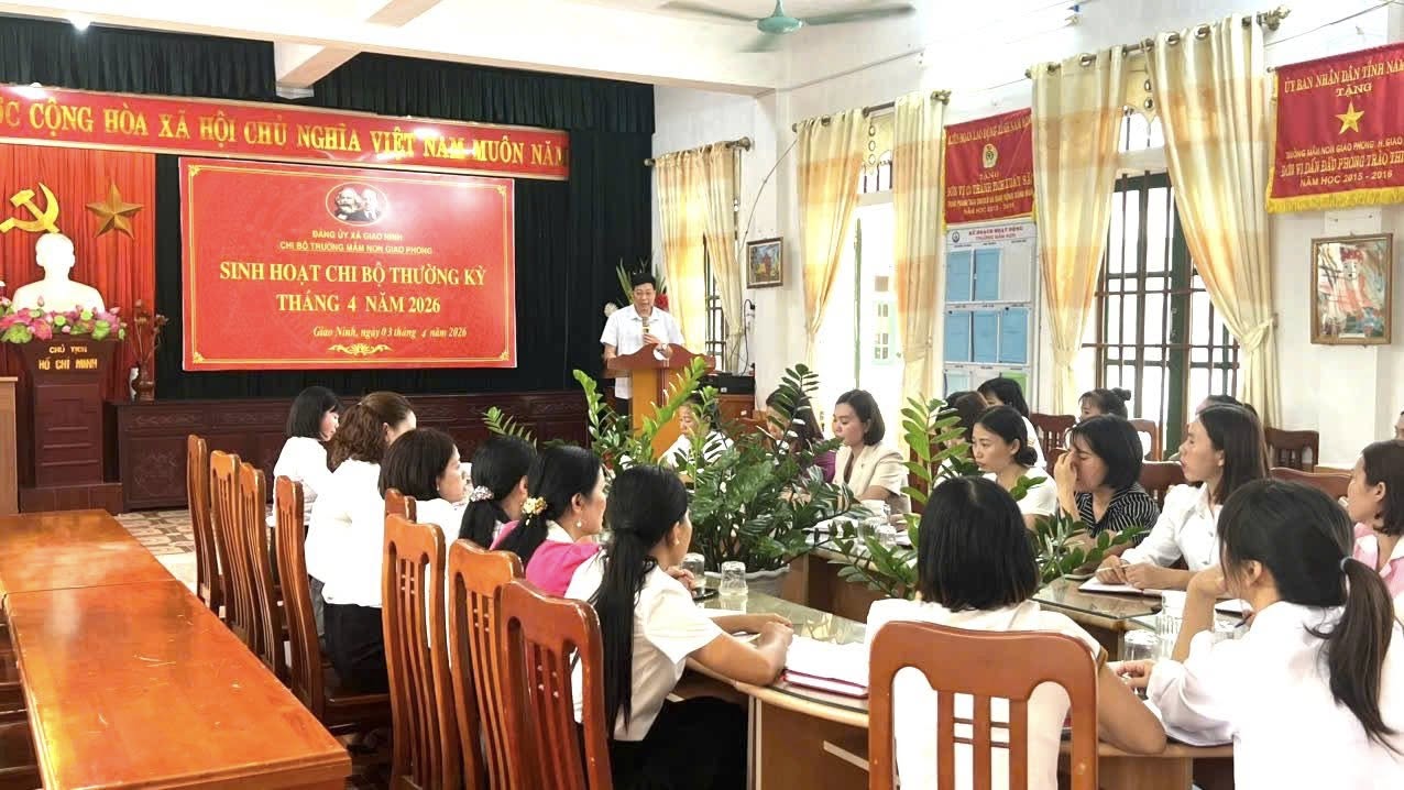 Thực hiện chương trình công tác Đảng năm 2026, Chi bộ Trường Mầm non Giao Phong đã tổ chức sinh hoạt chi bộ nhằm đánh giá kết quả thực hiện nhiệm vụ chính trị quý I và tháng 3 năm 2026; đồng thời triển khai nhiệm vụ quý II và kế hoạch tháng 4/2026 với tinh thần nghiêm túc, trách nhiệm, hiệu quả.